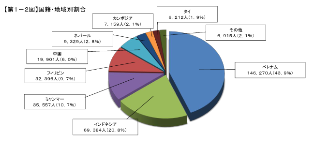 ベトナムからの在留外国人数が146,270人と全体の約44%を占めていますが、全体に占める割合は縮小傾向にあります。(2024年12月末では前年の約47%)